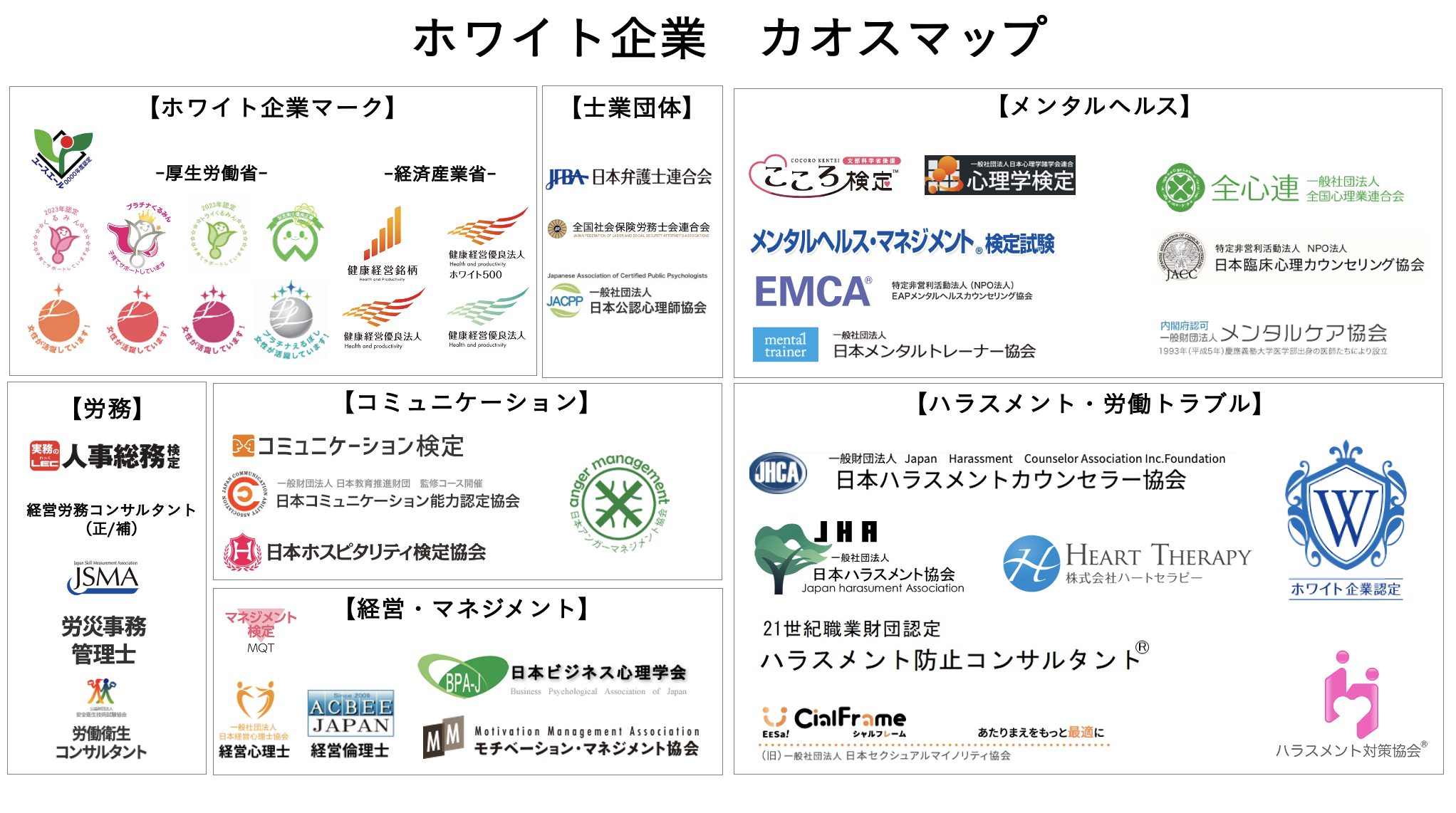 一般社団法人雇用クリーン財団(代表理事 酒井 康博、本社 東京都千代田区紀尾井町3-12 紀尾井町ビル6階)は、「ホワイト企業」分野での市場機会を明らかにするため、組織マネジメントに精通した兼頭竜矢氏(株式会社ソロモンリサーチ&コンサルティング 代表取締役)と、自身も起業家でもあり、国会議員としても日本企業における働きやすい環境を追求している赤木正幸氏(衆議院議員、不動産テック協会創設代表理事)」と連携し、網羅的・多面的に国内で初めてホワイト企業に関する資格、団体の市場を網羅的に分析した「ホワイト企業 カオスマップ」を作成しました。